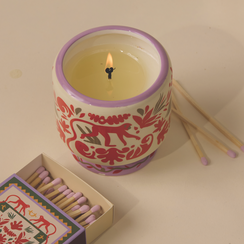 This A Dopo collection candle brings the zest and thrill of a Mediterranean summertime into your home. Each ceramic vessel is hand-painted with vibrant Moroccan-inspired hues and patterns, giving it an artisan feel. Made from 100% sustainable soy wax for a clean, consistent burn, the fragrance opens with black coconut, bitter lime and spiced bergamot, softened by hints of smoked patchouli, vetiver and white petals. A base of dark amber, tonka bean, musk and sandalwood completes the scent, creating a warm, inviting and subtly exotic atmosphere.
