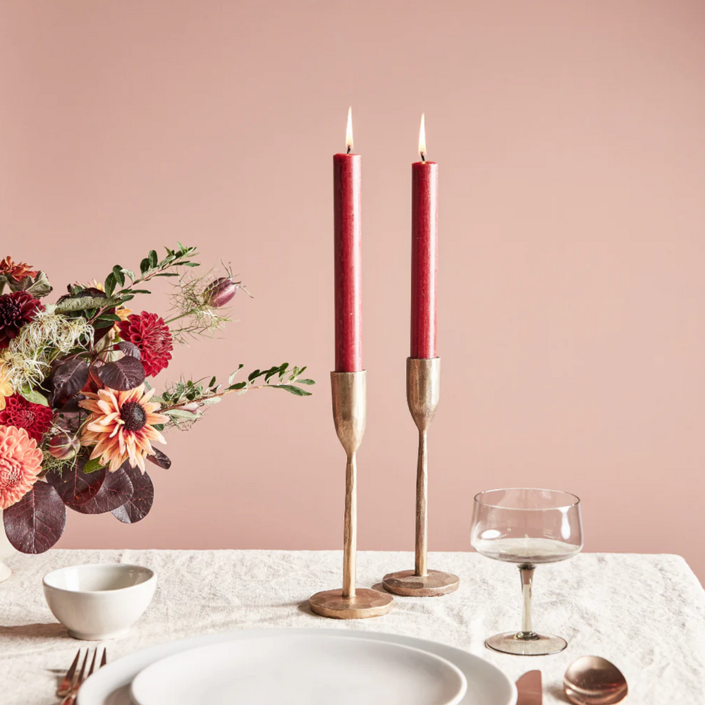 Add the soft glow of candlelight to your Interiors to create a cosy, inviting ambience, with this timeless Church candle handmade by artisans using traditional methods in a beautiful warm red colour made from a combination of mineral and vegetable waxes that give a high quality and consistent burn, display on their own or group together with some green ivy, berries and pretty blooms around the base for a festive table centrepiece.