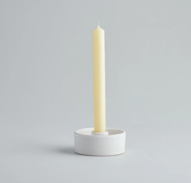 a simple yet elegant candle holder created with a combination of classic and contemporary design featuring a sleek & seamless design in matte white finish with dainty speckles ,crafted especially for our dinner candles, that will complete all interiors and look beautiful whilst securely holding your favourite candles in place.