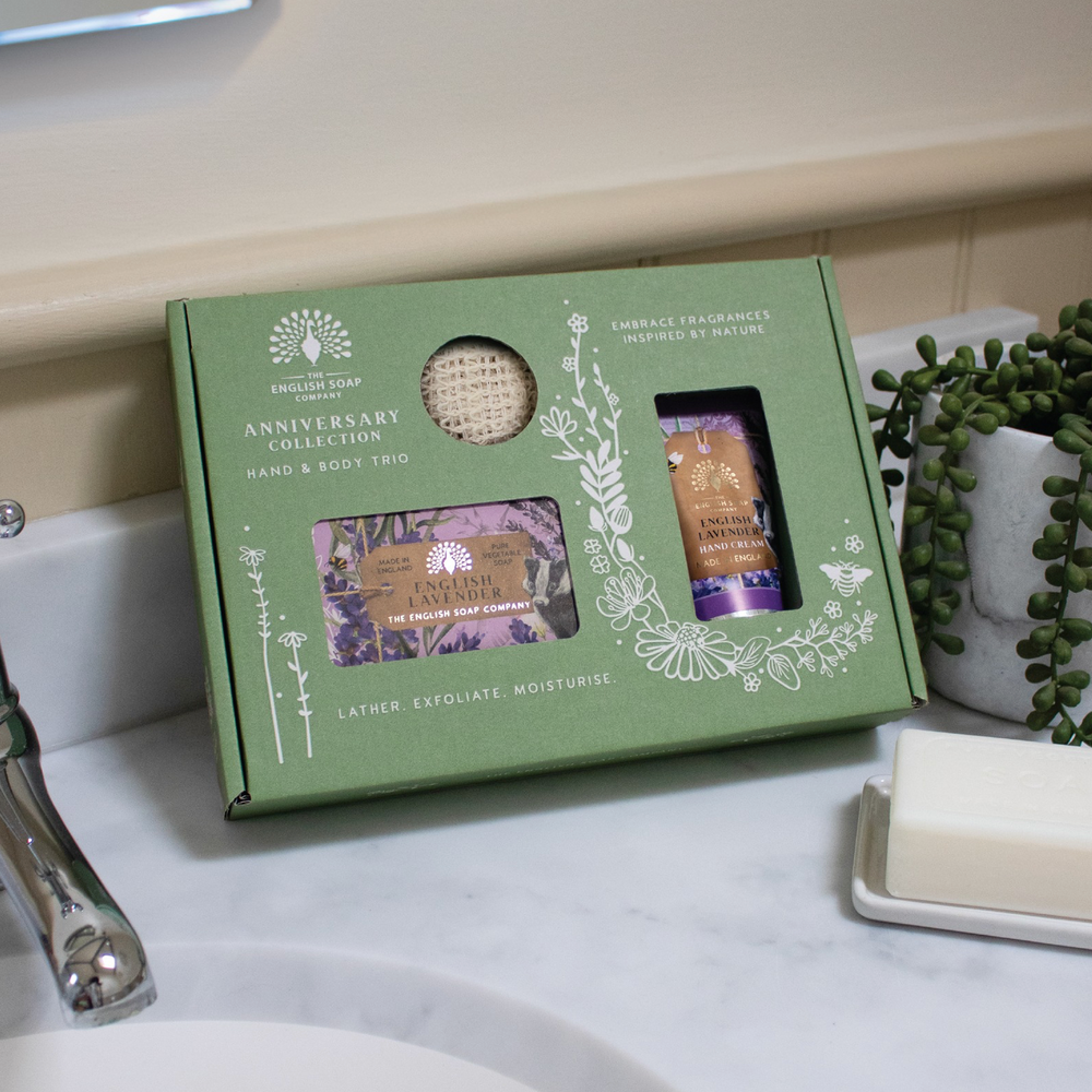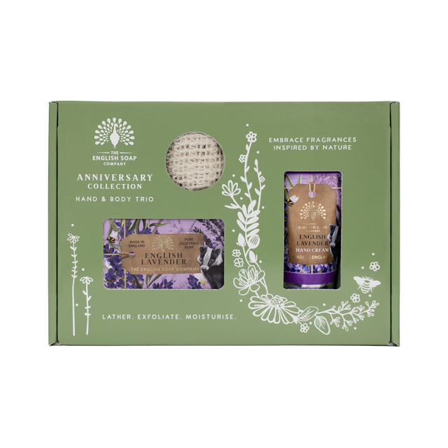 A luxury hand & body set from the anniversary collection, featuring hand and body soap bar, hand cream, and a reusable zero waste soap saver pouch, a brilliant exfoliating accessory for bath, shower, in a wonderful scent of calming lavender and rosemary, with mid notes of fresh mint and vanilla on a base of cedar and musks, enriched with moisturising shea butter and vegetable glycerine to nourish and care for the skin, perfectly presented in a gift box adorned with charming illustrations
