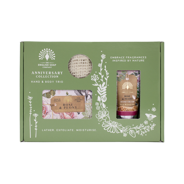 A luxury hand & body set from the anniversary collection, featuring hand and body soap bar, hand cream, and a reusable zero waste soap saver pouch, a brilliant exfoliating accessory for bath, shower, in a wonderful scent rose and peony, blackberry leaves, with mid notes of freesia, and raspberry on a base of white cedar, violet, heliotrope, and musk, enriched with moisturising shea butter and vegetable glycerine to nourish and care for the skin, perfectly presented in a gift box adorned with charming illustrations