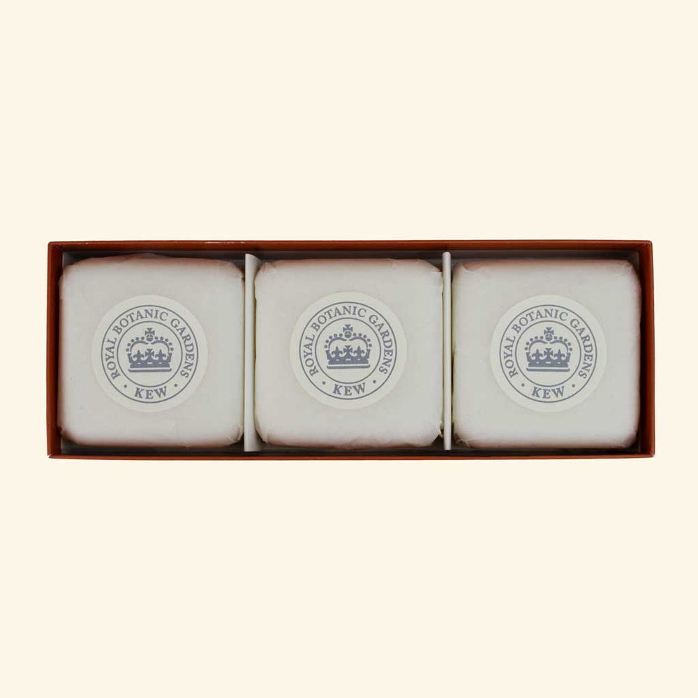 A luxury trio of soap set from the Kew Gardens collection, featuring three 100g individually wrapped soap bars in a wonderful scent of citrus and spice in the form of bergamot and ginger, a floral heart of lily, muguet, peony, rose, jasmine and carnation, balances with a rich base of amber, sandalwood and musks, enriched with moisturising shea butter and vegetable glycerine to nourish and care for the skin, perfectly presented in a gift box decorated with botanical illustrations from Kew’s historic archives.
