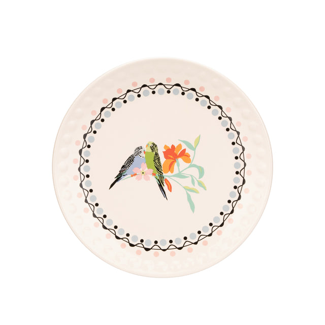 Brighten your dinner table with this stunning side plate from the painted table range, made from durable stoneware, featuring a gorgeous illustration of two adorable budgies finished with retro pattern that will instantly uplift your dining experience.