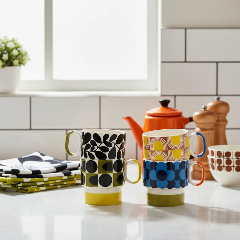 Elevate your daily brew with this stunning stacking mug, featuring on of orla’s timeless floral design with bold retro colour palette of blue & green with a contrasting orange oval shaped handle, that instantly transforms any kitchen into a style statement, the clever stacking design saves precious cupboard space whilst the durable stoneware construction ensures lasting enjoyment, the perfect everyday mug for tea, coffee and everything in between.