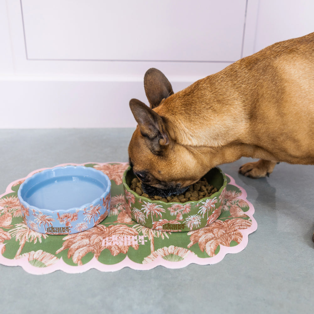 Featuring a gorgeous palm print with a pastel pink scalloped edge with a non-slip surface to prevent your pet bowls from moving around on the floor.