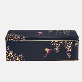 Made from stainless steel featuring a gorgeous illustration of exotic hummingbirds dancing in a lush confetti of shimmering leaves and exotic blossom in a navy background, finished with gorgeous gold detailing for an extra touch of luxur perfect for storing freshly baked biscuits & brownies.