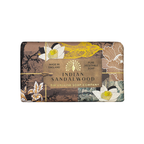 Indulge in a spa-like experience at home with this luxurious Indian sandalwood soap bar from the anniversary collection features a delightful fragrance of warm sandalwood and a touch of pepper, with mid notes of pine, orange flower, cedarwood and clove on a base of dry amber, tobacco and musk creating a rich & spicy scent enriched with moisturising shea butter and vegetable glycerine to nourish and care for the skin wrapped in fully recyclable paper and decorated with brightly painted illustrations inspired by natur a perfect addition to your bathroom, or an ideal gift for someone special.