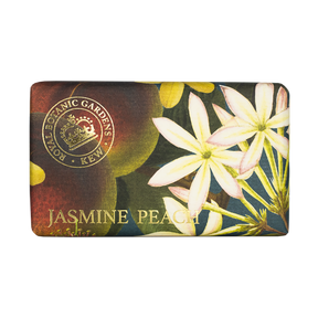 The Kew Gardens Jasmine Peach Soap, a fresh, bright fragrance with heart notes of stephanotis, jasmine and orange blossom which complement the fruity top notes of wild strawberry, peach, kiwi and banana, enriched with moisturising shea butter and vegetable glycerine to nourish and care for the skin, wrapped in a printed paper with beautiful illustrations inspired by the plants, from Kew’s historical archives.