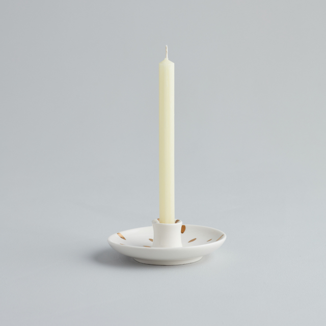 a simple yet elegant candle holder created with a combination of classic and contemporary design featuring a sleek & seamless design in matte white finish with gold brushmarks ,crafted especially for our  mini candles, that will complete all interiors and look beautiful whilst securely holding your favourite candles in place.