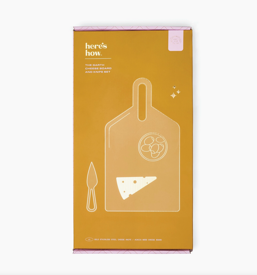 Elevate your entertaining with this expertly crafted Cheese Board and Knife Set from Here's How, designed for precision and style, the set includes a durable board made from natural acacia wood paired with a stylish gold plated stainless steel cheese knife, great for serving cheese, charcuterie platters and assorted hors d’oeuvres perfect for hosting or gifting.