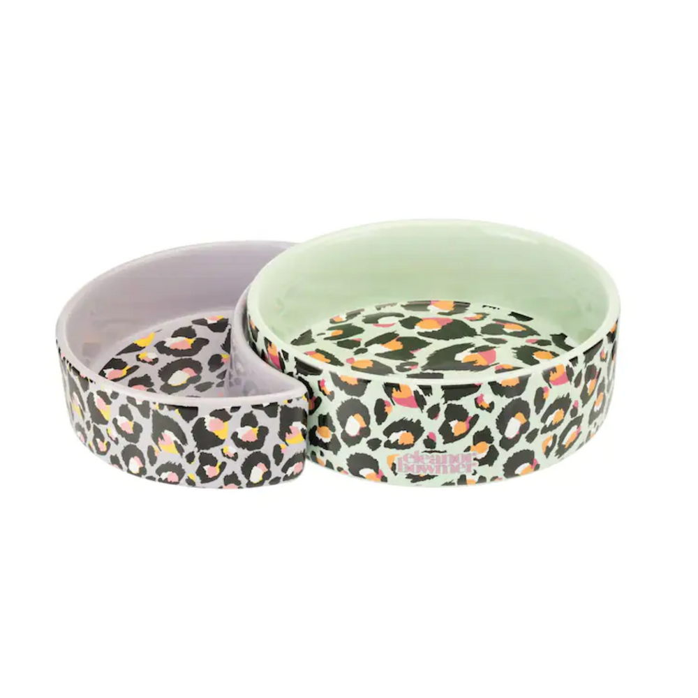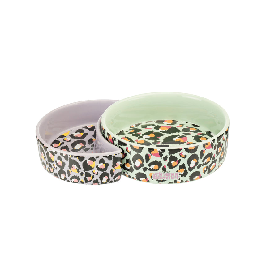 This adorable pet bowl set features a traditional round bowl and a half-moon side bowl that slots neatly together in a gorgeous leopard print contrasting pastel mint green & purple colours, made from durable stoneware, stackable for easy storage, perfect for cats & dogs alike.