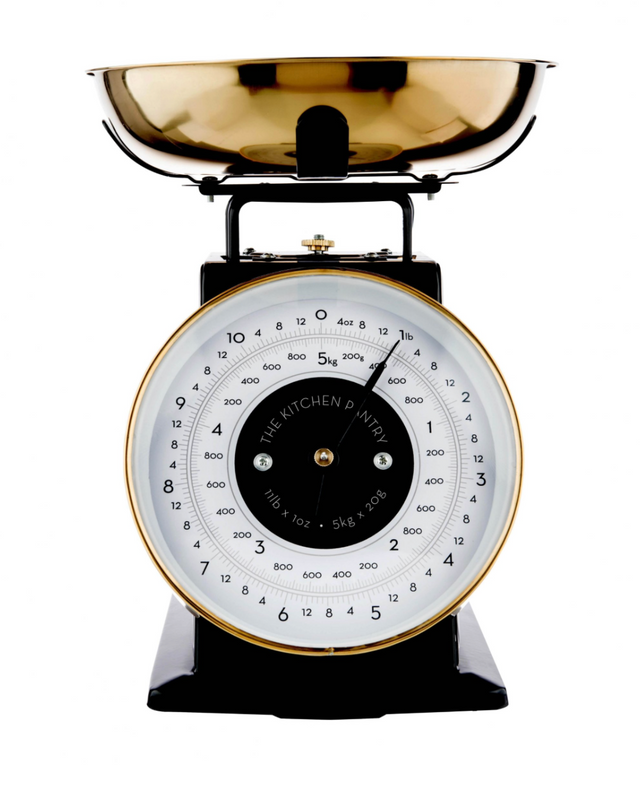 Add vintage charm to your kitchen with this attractive mechanical scale, in an eye-catching black and brass finish that will make a perfect centrepiece in your kitchen, featuring an elegant and functional design with easy-to-read metrics and imperial dials and a 5 KG capacity that will make cooking for friends and family a joyful occasion.