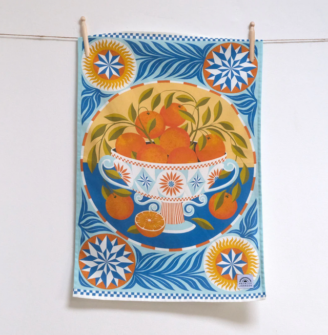 Brighten up your tablescape with this stunning vibrant, eye-catching mediterranean inspired printed tea towel, featuring a kylix bowl brimming with oranges, against a backdrop of bold cobalt blue and white, that will inject a mediterranean holiday vibes to any kitchen.