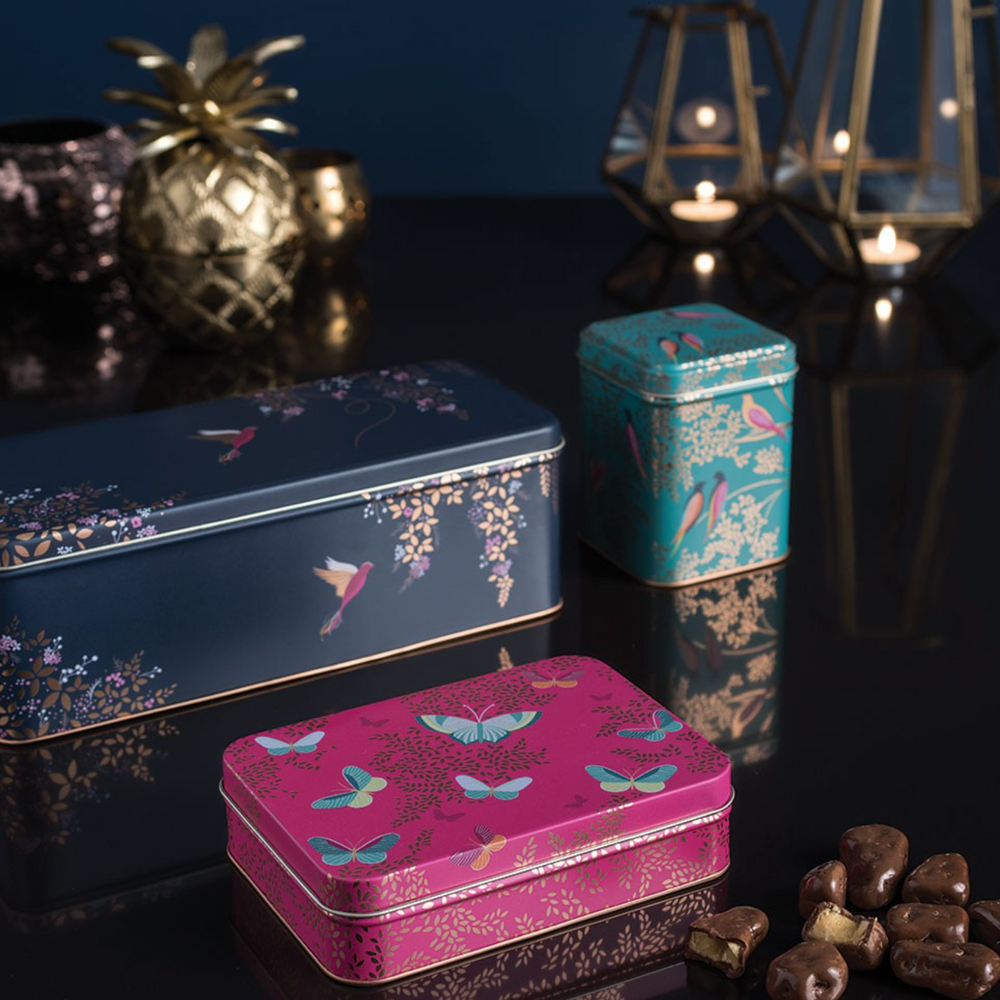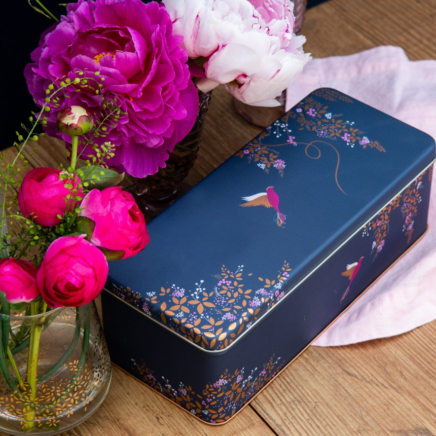 Made from stainless steel featuring a gorgeous illustration of exotic hummingbirds dancing in a lush confetti of shimmering leaves and exotic blossom in a navy background, finished with gorgeous gold detailing for an extra touch of luxur perfect for storing freshly baked biscuits & brownies.