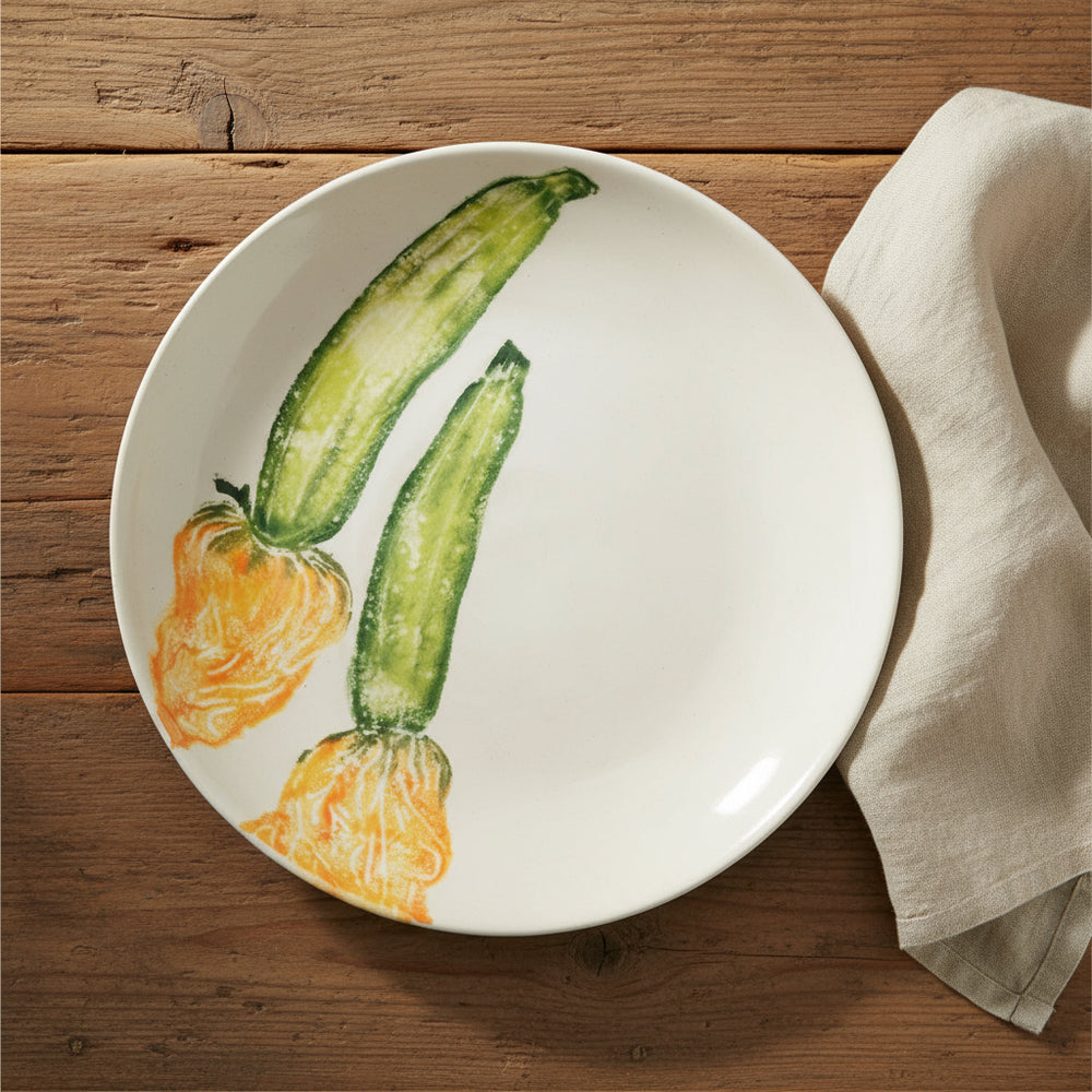 Turn each meal into a vibrant experience with this stunning supper plate made from high-quality earthenware, featuring gorgeous hand printed illustration of a brightly coloured courgette with it flower painted in beautiful water colours capturing the freshness of the vegetable, mix and match with other items from the range for a truly stunning tablescape.
