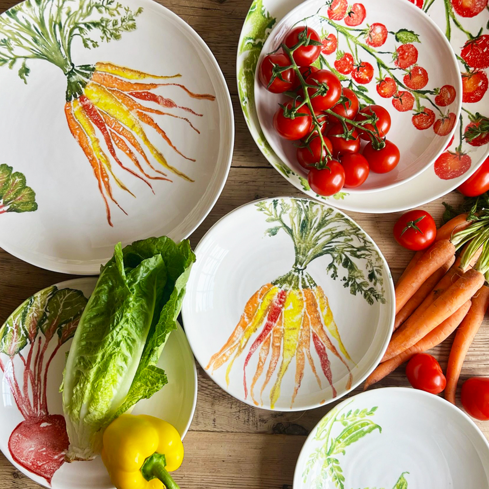 Turn each meal into a vibrant experience with this stunning supper plate made from high-quality earthenware, featuring gorgeous hand printed illustration of a brightly coloured heritage carrot, painted in beautiful water colours capturing the freshness of the vegetable, mix and match with other items from the range for a truly stunning tablescape.