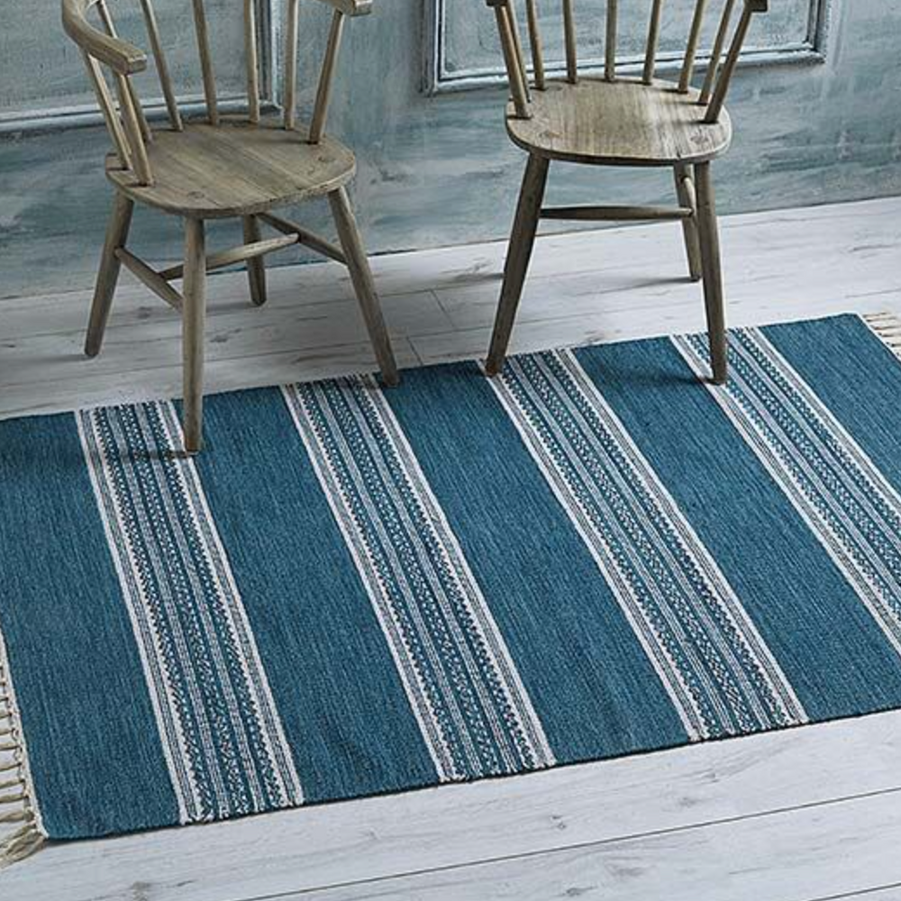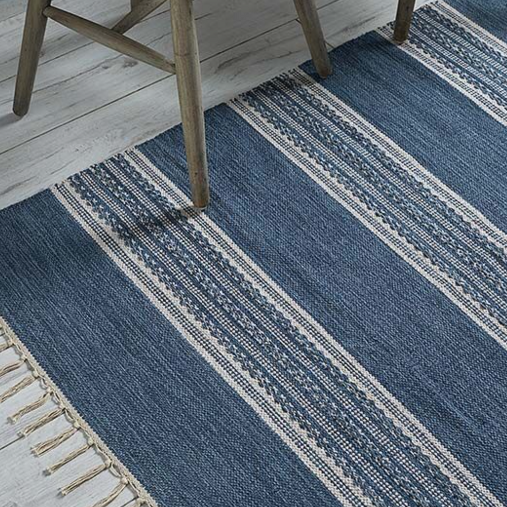Give your home some spring colours, with this simple yet elegant rug, made from %100 cotton dipped dyed in a beautiful blue colour woven in a gorgeous geometric pattern finished with a knotted fringe edge that will add texture and colour and instantly transform any room in your home.
