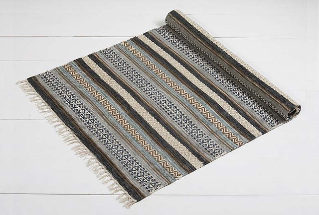 The Jutland rug is made from 100 % cotton in slate grey and khaki tones hand weaved in stripes and geometric pattern finished with knotted tassels, with a lovely texture that is perfect for the entrance hall, kitchen or bedroom.