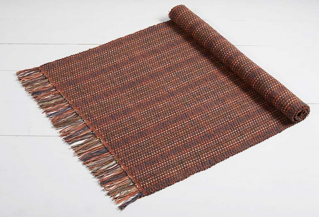 The Jura rug is made from 100 % cotton in gorgeous autumn tones of terracotta and blue and ochre hand-weaved in a beautiful pattern and finished with a fringed edge with a lovely texture that is perfect for the entrance hall, kitchen or bedroom.