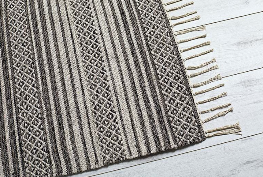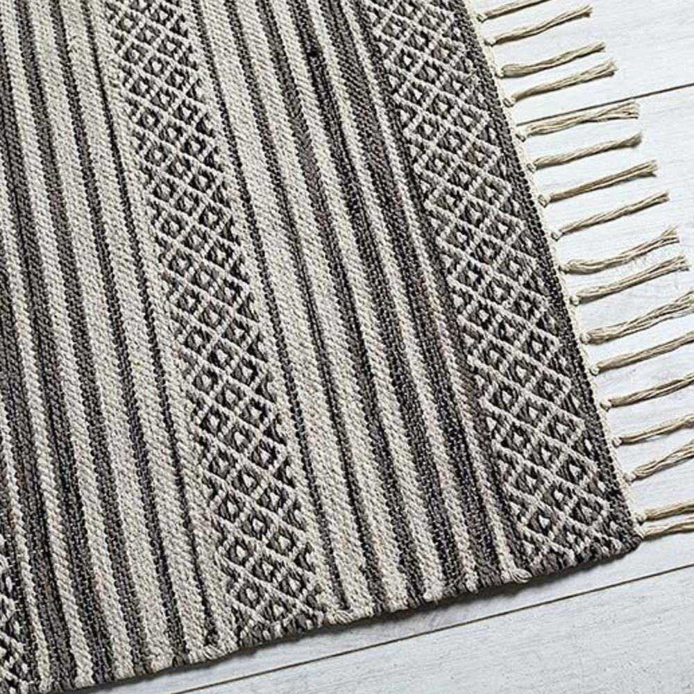 The Jutland rug is made from 100 % cotton in charcoal grey and white tones hand weaved in stripes and geometric pattern finished with knotted tassels, with a lovely texture that is perfect for the entrance hall, kitchen or bedroom.