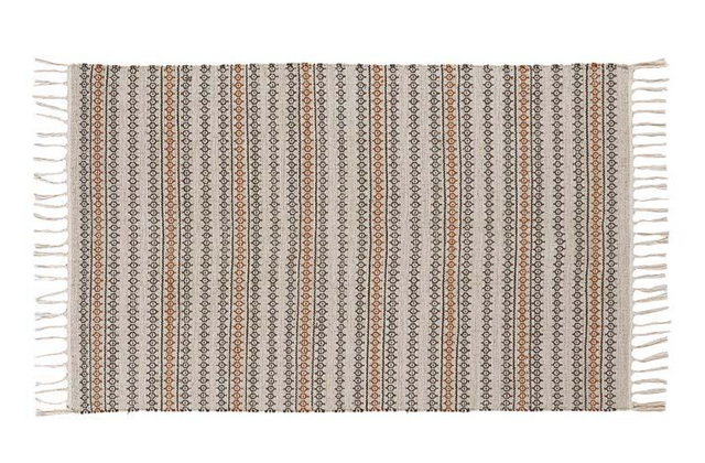 The Juva rug is made from 100 % cotton hand-weaved by skilled artisans in a beautiful geometric pattern in a lovely grey and terracotta colours finished with knotted fringing. is perfect for the entrance hall, kitchen or bedroom.