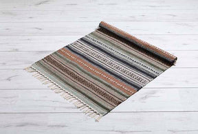This beautiful rug is made from 100 % cotton in olive green and brown tones hand weaved in stripes and geometric pattern finished with knotted tassels, with a lovely texture that is perfect for the entrance hall, kitchen or bedroom.