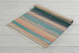 The Portree rug is made from 100 % cotton hand-weaved by skilled artisans in a beautiful geometric pattern in a lovely tones of blue & coral finished with knotted fringing. is perfect for the entrance hall, kitchen or bedroom.