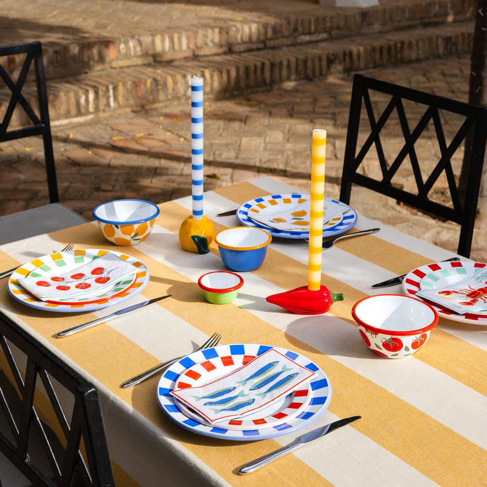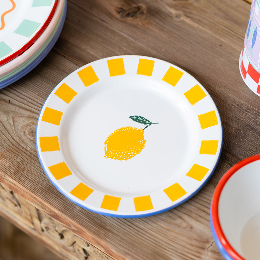 This gorgeous side plate features a playful bright lemon motif with a striped yellow border that will inject a Mediterranean sunshine to your meals, made from hardwearing, lightweight and shatterproof enamel hand finished and dipped multiple times to achieve its vibrant colours , great for both picnics and relaxed indoor dining & summer garden parties.