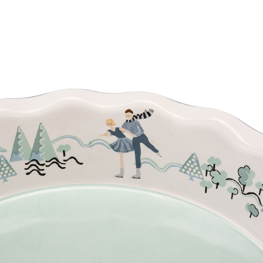 Featuring a delightful scalloped rim and a whimsical winter wonderland design, with intricate illustrations of stunning picturesque winter landscape showcasing a frosted forest and elegant ice skaters gliding across a snowy scene, the exterior rim is beautifully adorned with a pair of wavy pink ribbons filled with ditsy flowers, dotted with red hearts, holly and roses, transporting you to a magical seasonal moment with every use.