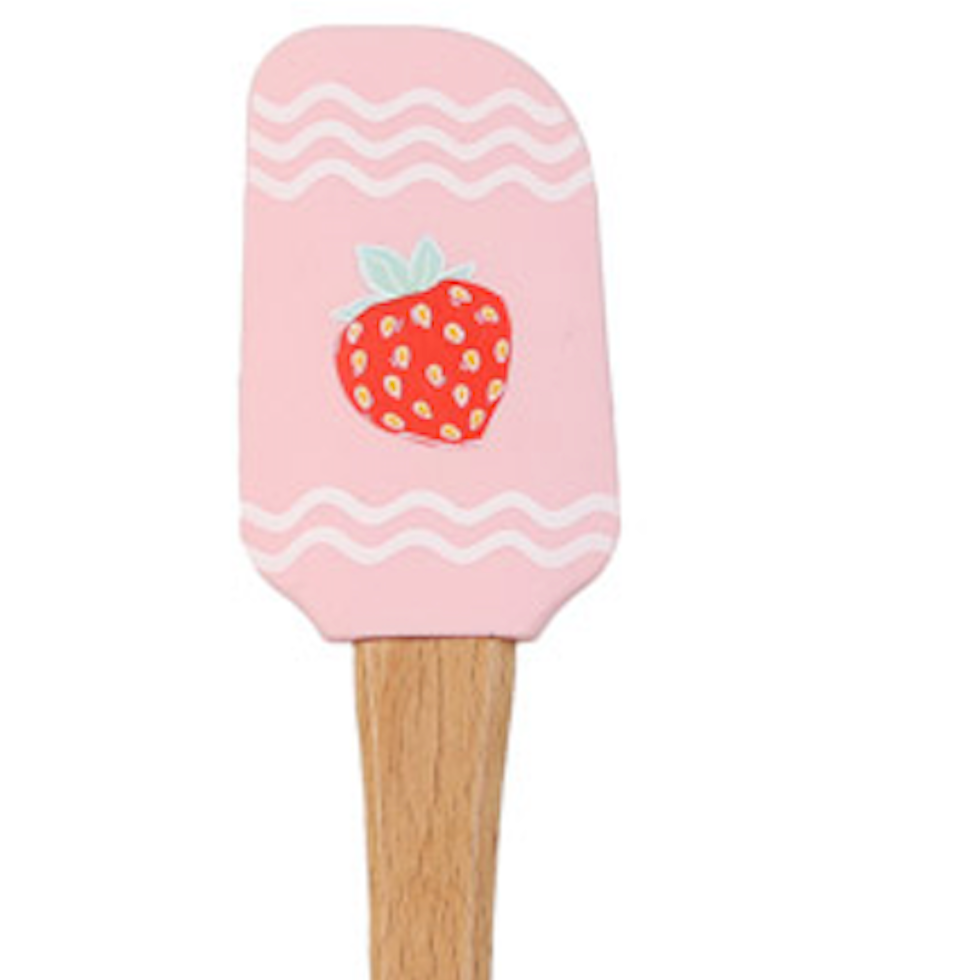 Made from food-safe silicone to protect your cookware from scratches, in a soft pink colour with an playful strawberry motif in the centre, paired with an FSC®-certified wooden handle, Ideal for folding, scraping, and mixing.