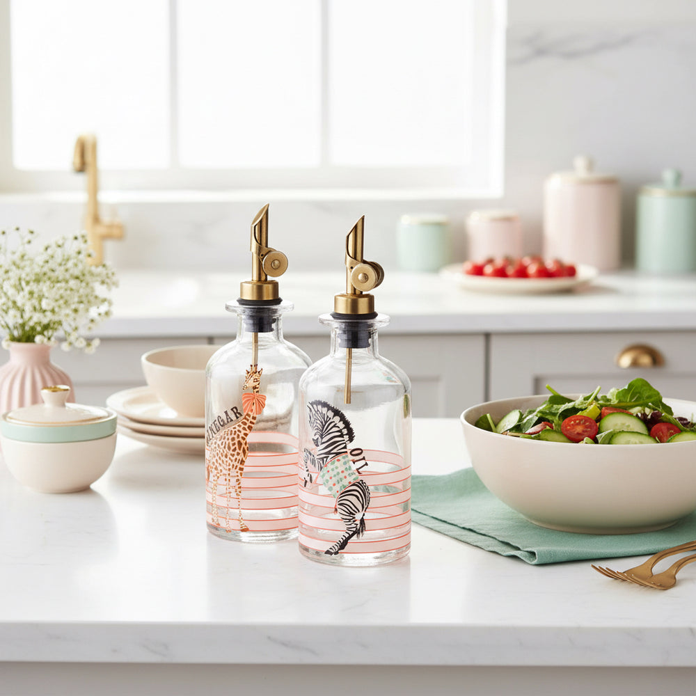 Elevate your kitchen with this charming glass oil & vinegar set features Yvonne’s iconic giraffe & Zebra illustrations that add a playful twist to kitchen ,in a sleek & functional design , Perfect for drizzling your favourite oils and vinegars over salads, pasta, and roasted vegetables.
