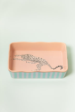 This gorgeous vintage-style oven dish, made of high-quality stoneware featuring a beautiful cheetah on a pastel peach colour and contrasting vintage-style jade candy stripes finished with gilt gold detailings, perfect for all your culinary creations from pies to sweet treats.