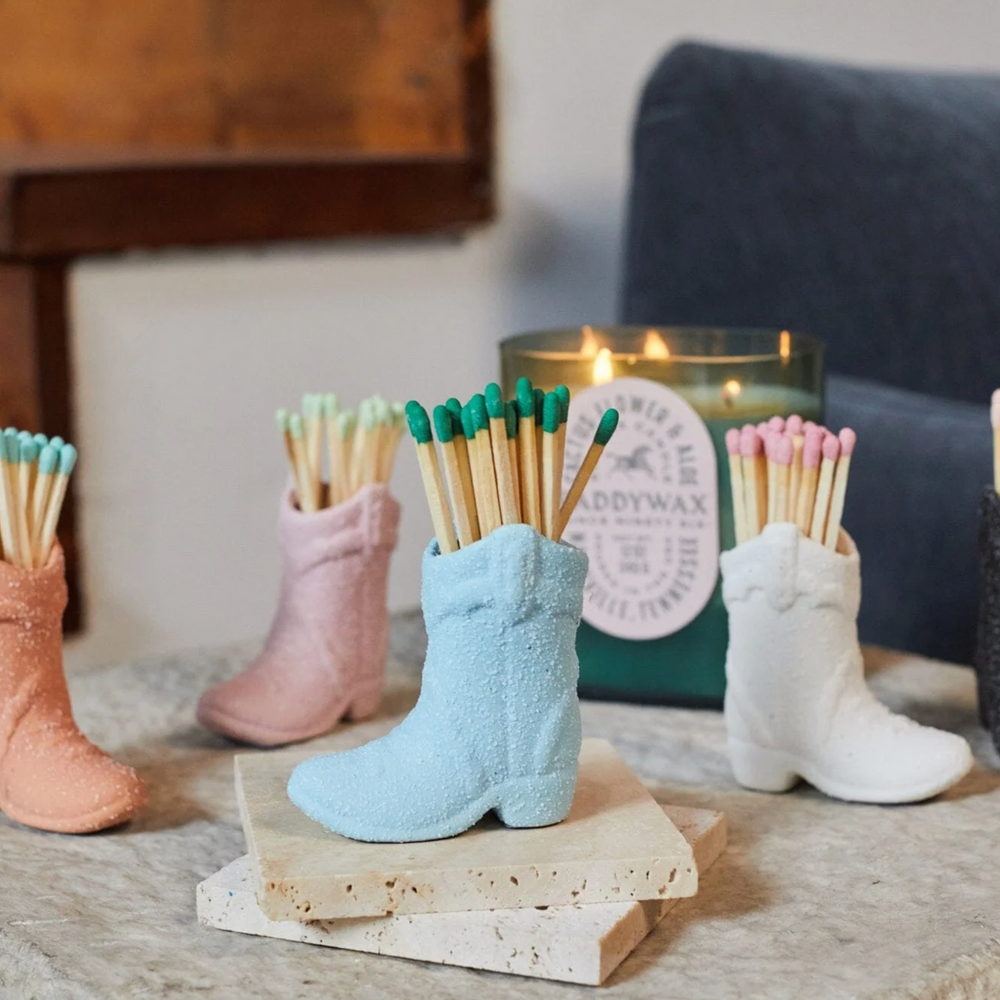 These luxury matches offer a reliable and elegant way to light your candles, fireplaces, or grills safely and effortlessly, crafted with care from high-quality materials featuring a gorgeous vintage-inspired ceramic cowboy boot with 25 safety matches that are easily lit with a strike on the bottom of the boot, after the safety matches run out, refill with any matches brand.