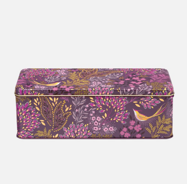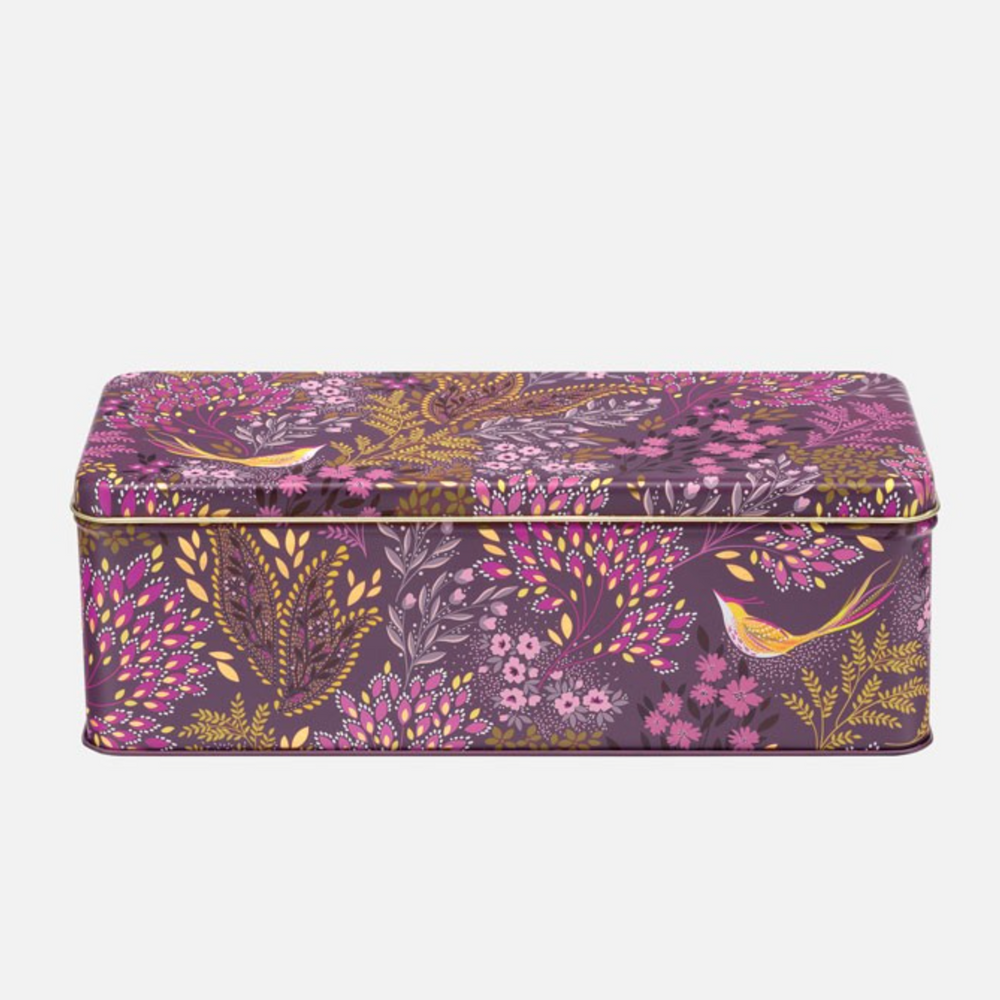 Made from stainless steel featuring a gorgeous illustration of exotic songbirds perched amongs colourful tree blossoms set against rich plum and pink backdrops and finished with gorgeous gold detailing.finished with gorgeous gold detailing for an extra touch of luxur perfect for storing freshly baked biscuits & brownies.