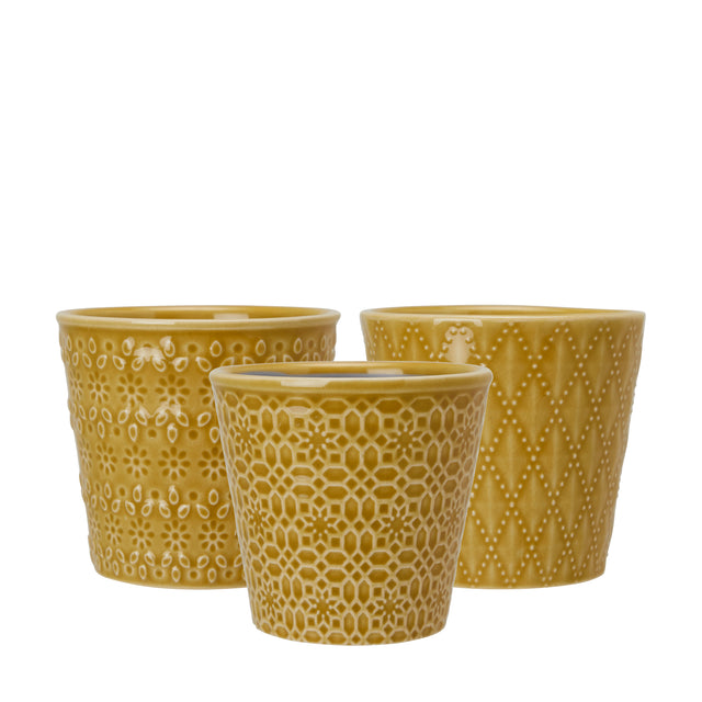 Add a splash of colour to your home, with this playful mini planters featuring beautiful embossed geometric patterns in a beautiful mustard yellow colour finished with a smooth & glossy glaze that will adds a touch of timeless beauty to any space.