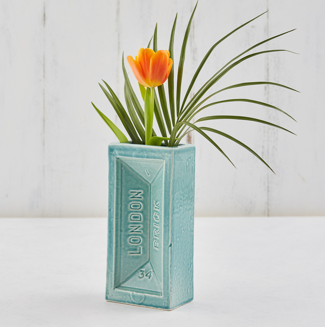 This tendy vase features the iconic London brick with its classic ‘frogged’ shape capturing the essence of the city, design and handmade in England from ceramic Earthenware with a smooth glossy glaze  in a gorgeous turquoise blue colour that is water-tight for flowers and plants or great for stationery or kitchen utensils, that will add an industrial aesthetic to any interior.