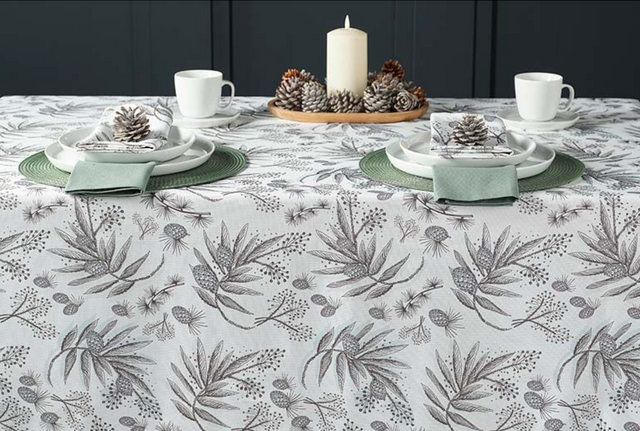 This contemporary and stylish tablecloth features a beautiful print of larch branches & pine cones that will instantly uplift your dining experience.