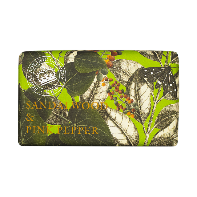The Kew Gardens Sandalwood and Pink Pepper Soap is a woody fragrance with a rich and spicy scent with a heart of pine, orange flower, cedarwood and clove on a base of dry amber, tobacco and musks, enriched with moisturising shea butter and vegetable glycerine to nourish and care for the skin, wrapped in a printed paper with beautiful illustrations inspired by the plants, from Kew’s historical archives.
