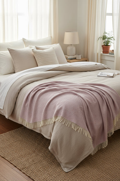 Bronte By Moon Herringbone Pure New Wool Throw, Sugared Almond