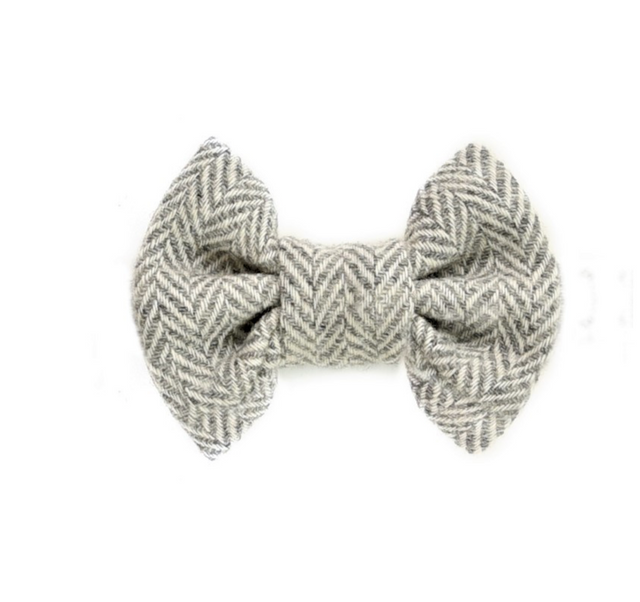 This adorable tweed bow is crafted from pure new wool, featuring a classic herringbone pattern in a gorgeous silver grey colour, that fits by threading it to your dog's existing collar.