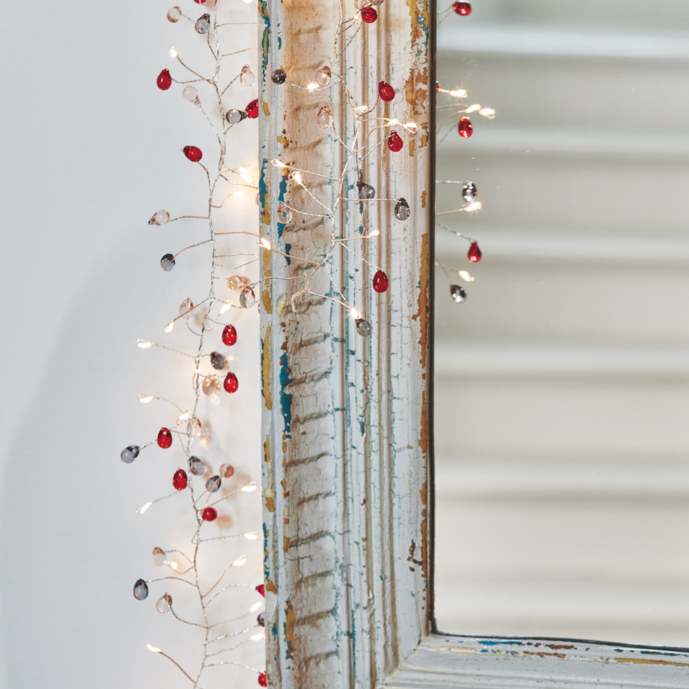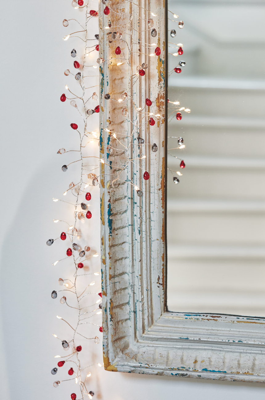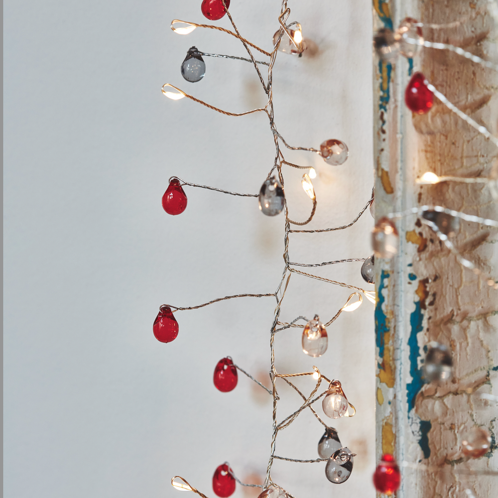 This festive handmade fairy light features beautiful warm-coloured beads entwined with 200 warm white LED lights wrap-around candles with some red berries, pine cones and pretty blooms for a festive table centrepiece, or place on your mantlepiece or window sills for a dazzling light display that will brighten up your home.