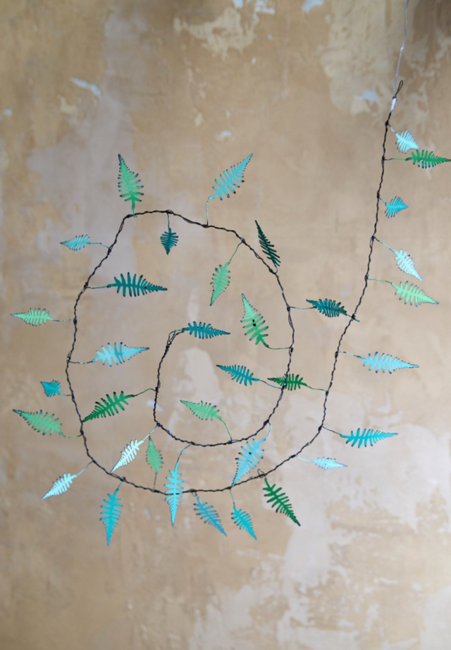 Gorgeous fairy lights featuring handmade and hand-painted metal green fern leaves, entwined with 20 warm white LEDs lights.