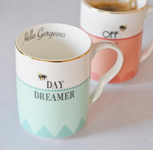 This gorgeous mug set features a pastel blue and soft peach, with quirky slogans, and gilt gold edge details and ridged handle, made of high-quality bone China.