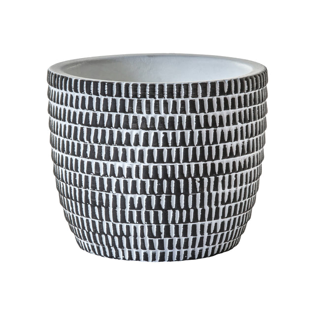 Created using Nordic colour palette, and organic shapes, the doura planter is a simplistic, unimposing planter, with a clean and minimalist design, made from concrete in matt black with white geometric stripes that's adds dimension to each piece, this beautiful planter will complement any decor in your home creating a calm and harmonic feel throughout your home.