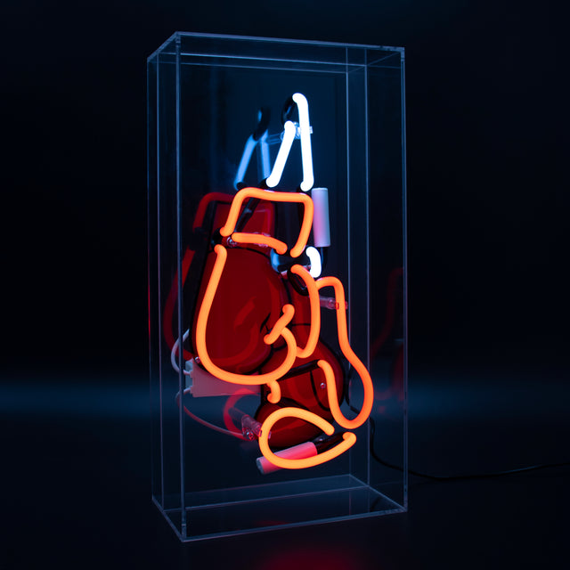 The Boxing Gloves are made up of red & white neon lights, encased in a clear glossy acrylic box.