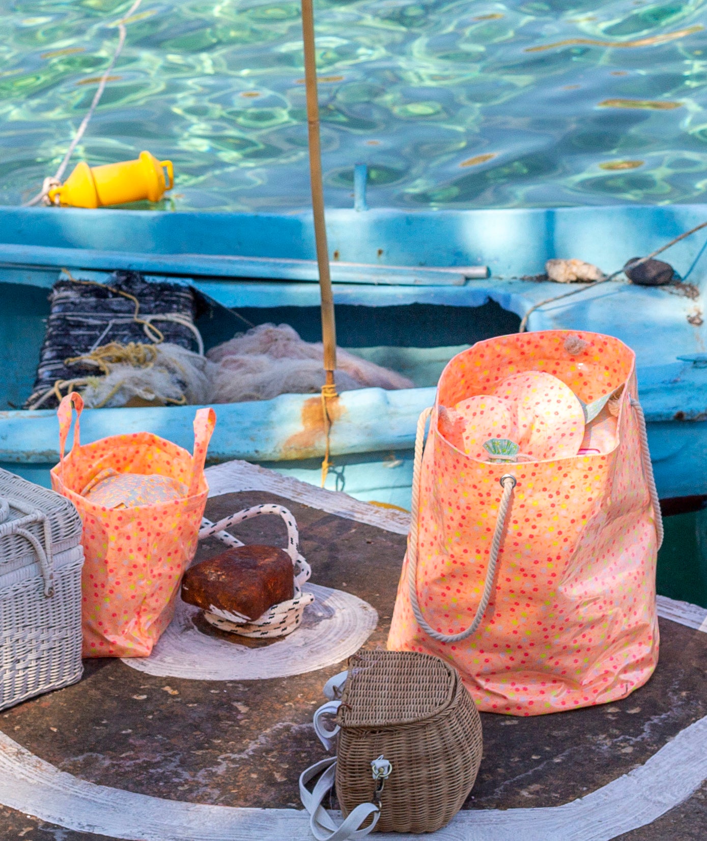 Made from 100% okeo- tex certified coated cotton, in soft peach colour and gorgeous floral pattern and two braided rope handles, it can also be used as a beach, pool or picnic bag.