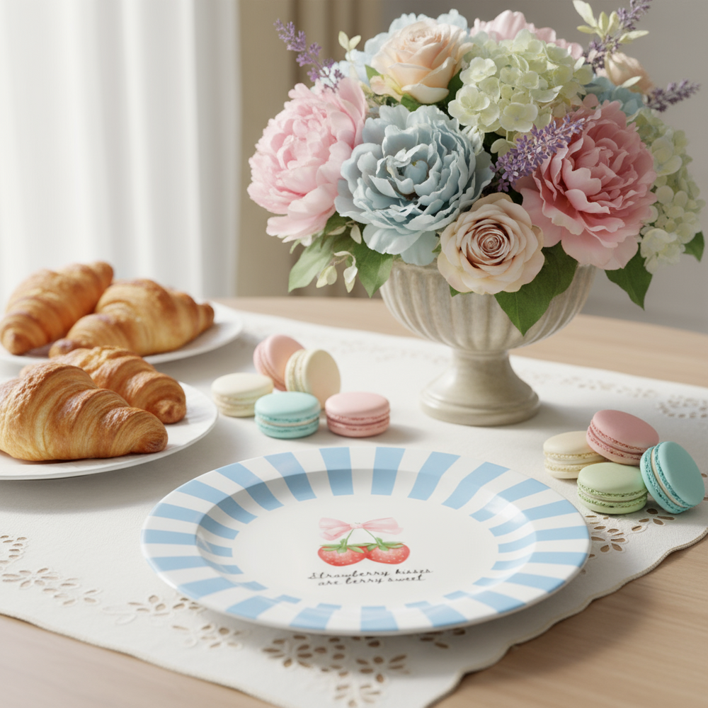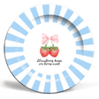 Crafted from durable ceramic, combining a playful design with everyday practicality, featuring a stunning hand printed strawberries with a pink bow on top finished with a pastel blue striped rim, perfect for serving appetizers, desserts, or snacks, that will bring a delightful pop of personality to any meal.